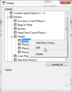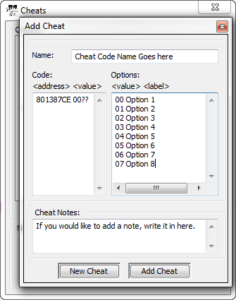 Just highlight the game you want to add to and then right click on your mouse. Choose the Edit Cheats Option & click it to get to the Menu. Or if you want to add while playing a game, Select System in MiB64 and from there “Cheats”. Also you can press Ctrl C to access the MiB64 Cheats Menu